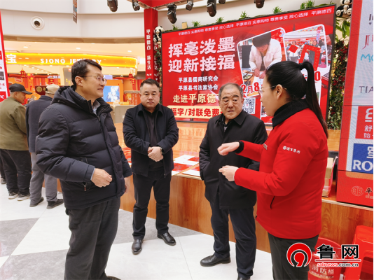 鲁网2月11日讯(记者 逯广宇 通讯员 赵慧)为弘扬中华优秀传统文化,传承新时代儒商精神,营造浓厚的节日氛围,2月8日上午平原工委会在党支部书记张友国、工委副主任王兴军带领下,组织8名优秀书法家走进平原德百商场,开展 “翰墨传承优秀文化,儒商送福情暖人心”为顾客送春联活动。